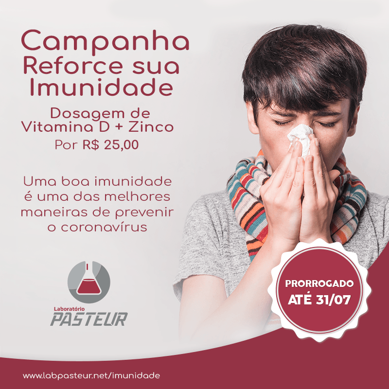 O Laboratório Pasteur está lançando a campanha “Reforce sua Imunidade”, com condições especiais para dosagem sanguínea destas 2 substâncias em conjunto.